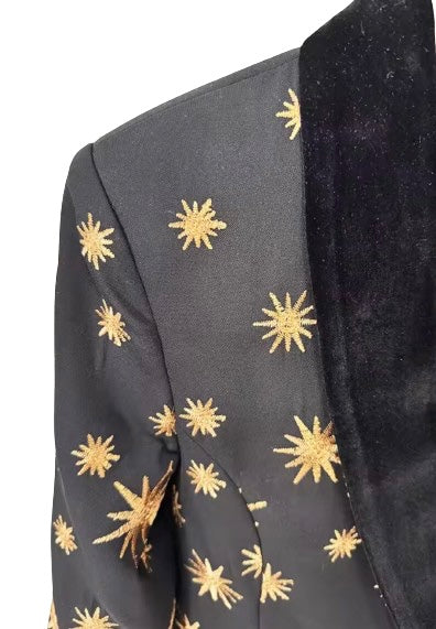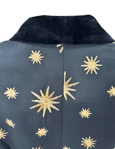 Experience high-fashion with the Cher Jacket and Pants Set. This luxurious matching suit features a striking embroidered star print for a unique touch. The velvet lapels on the jacket and feather cuffs add a touch of elegance. Elevate any outfit with this statement set.