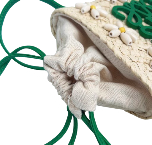 Introducing the Inka Bag, a must-have accessory for any summer outfit. Made from durable raffia, this small bag features a convenient internal canvas drawstring pouch for easy organization. The sweet beaded daisies add a touch of charm and elegance. Perfect for any occasion, from a day at the beach to a night out on the town.