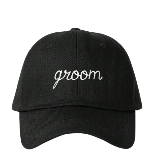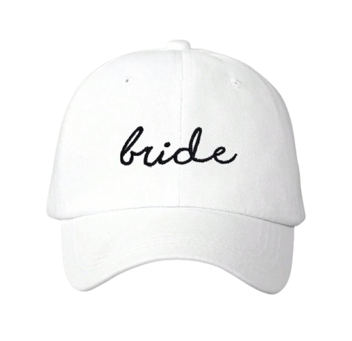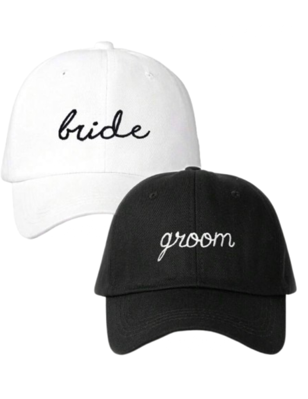 Elevate your wedding day accessories with the Bonnie Cap Set. This set includes two caps, one with 'bride' stitched in white and the other with 'groom' in black. Designed with a fully adjustable size for the perfect fit on your special day.