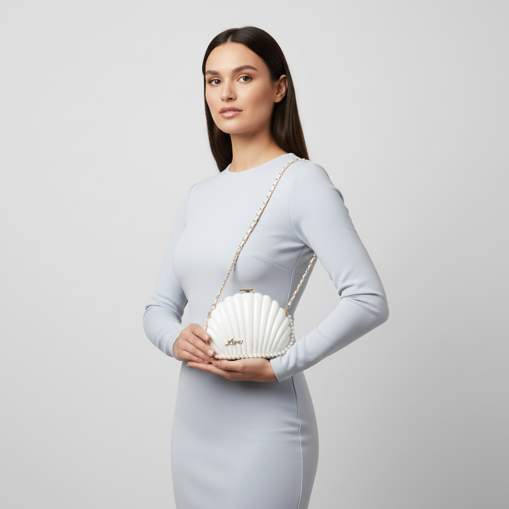 The Marina Bag, measuring 20 x 8 x 10 cm, features a distinctive shell shape and includes a durable chain strap alongside a shorter, detachable pearl strap. This design allows for versatile styling options while the structural integrity of the bag ensures long-lasting use.